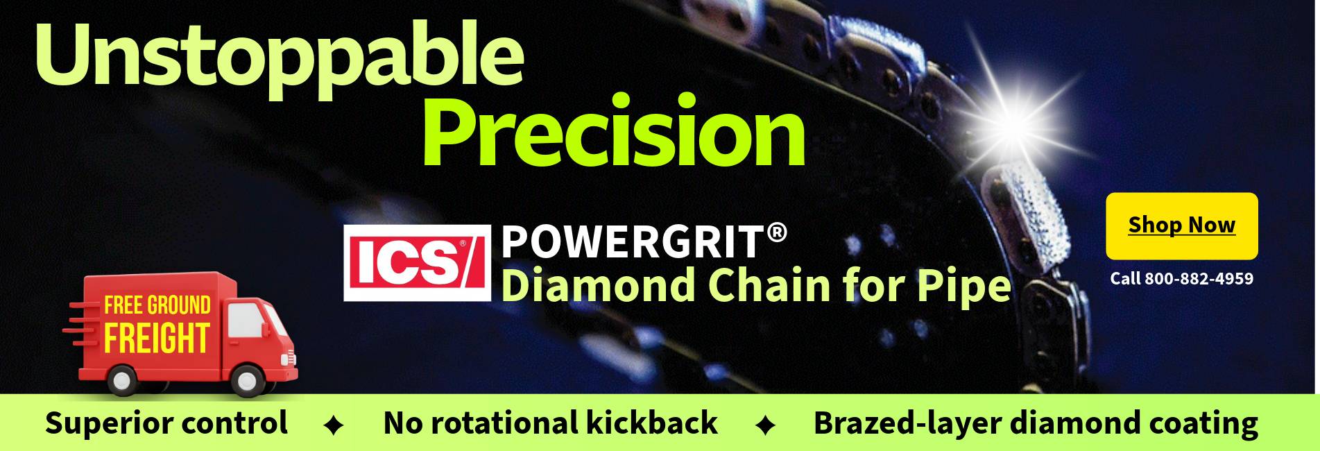 Cutting in-ground utility pipe is easier and safer than ever when you use ICS PowerGrit® chains. Includes: Powerhead, guidebar, TWO Chains, Free Ground.